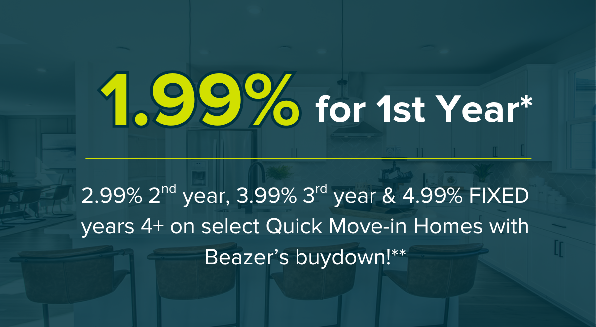 *Offer available at a fixed rate of 4.99% on a pool of limited funds available only from V.I.P. Independent Mortgage, Inc NMLS #145502, Benchmark Mortgage NMLS#2143 or Guild Mortgage NMLS#3274 for select QMI homes located in Houston, Dallas, or San Antonio, contracted between 8/7/2025 and 8/31/2025 and assumes buyer’s qualification for lender’s program and qualification for and use of a Beazer Homes closing cost credit for a 3-2-1 temporary interest rate buy down. Beazer Homes is not acting as a mortgage broker or lender. Loan program and pricing available through V.I.P. Independent Mortgage, Inc NMLS #145502, Benchmark Mortgage NMLS#2143 or Guild Mortgage NMLS#3274. First year monthly payment of $1,265 is for illustrative purposes only and assumes a sales price of $309,590, a down payment of $10,840, and borrower qualification for an FHA 30-year fixed rate mortgage loan with a 3-2-1 temporary buy down feature in the amount of $304,000 (including Upfront Mortgage Insurance Premium) with an interest rate of 4.990% (5.704% Annual Percentage Rate(APR)) for the life of the loan. First year payment is based on an effective rate of 1.990%. Estimated monthly payment year 2 is $1,423 and based on an effective rate of 2.990%. Estimated monthly payment year 3 is $1,593 and based on an effective rate of 3.990%. Estimated monthly payment year 4 through 30 is $1,773 and based on an effective rate of 4.990%. No pre-payment penalty applies. Monthly payment includes principal, interest, estimated taxes, estimated homeowners insurance and monthly mortgage insurance premium only; any other fees such as HOA not included and will result in a greater monthly payment amount. Actual property taxes and homeowners insurance may be higher, resulting in higher monthly payment. Interest rates effective 8/7/2025, based on a 680 credit score, and are subject to change without notice. Assumes borrower completes credit application, meets established credit guidelines, and sets up a tax and insurance escrow account with lender. Buyer may obtain financing from any qualified lender, but this offer is only available from the lenders named above. This offer is subject to lender underwriting guidelines, which are subject to change without notice, and is available only for owner-occupied homes. V.I.P. Independent Mortgage, Inc NMLS #145502, Benchmark Mortgage NMLS#2143 or Guild Mortgage NMLS#3274 do Business in Accordance with Federal Fair Lending Laws. V.I.P. Independent Mortgage, Inc NMLS #145502, Benchmark Mortgage NMLS#2143 or Guild Mortgage NMLS#3274 are not acting on behalf of or at the direction of the FHA/HUD or the Federal Government. This product or service has not been approved or endorsed by any governmental agency, and this offer is not being made by any agency of the government V.I.P. Independent Mortgage, Inc NMLS #145502, Benchmark Mortgage NMLS#2143 or Guild Mortgage NMLS#3274 are approved to participate in FHA programs but the products and services performed by V.I.P. Independent Mortgage, Inc NMLS #145502, Benchmark Mortgage NMLS#2143 or Guild Mortgage NMLS#3274 are not coming directly from HUD or FHA. Information, rates, and programs are subject to change without notice. All products are subject to credit and property approval. Not all products are available in all states or for all loan amounts. Other restrictions may apply. This is not a lender offer to enter into an agreement. Not all customers will qualify. Rates are subject to change; this is not a commitment to lend. See New Home Counselor for a list of qualifying homes and complete details. © 2025 Beazer Homes.